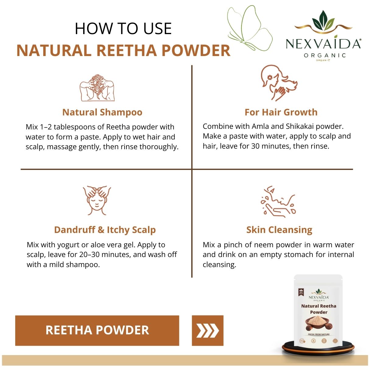 Nexvaida Organic Natural Reetha Powder is a pure and eco-friendly hair care solution, traditionally used as a natural shampoo. Rich in saponins, it gently cleanses the scalp, promotes hair growth, prevents dandruff, and strengthens hair from root to tip. Its antibacterial and anti-inflammatory properties make it effective for controlling scalp infections and soothing irritation. Being chemical-free and safe, it is suitable for all hair types and even sensitive scalps.