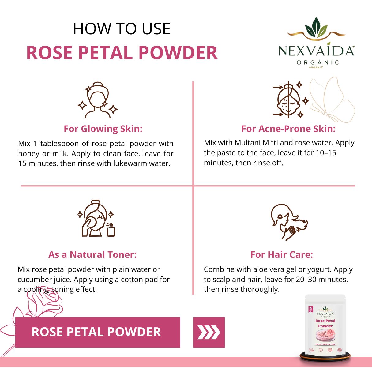 Bring the timeless beauty secret of roses into your skincare routine with Nexvaida Rose Petal Powder. Made from 100% pure, natural, and organic rose petals, this powder is a gentle yet powerful solution for glowing, refreshed, and healthy skin.